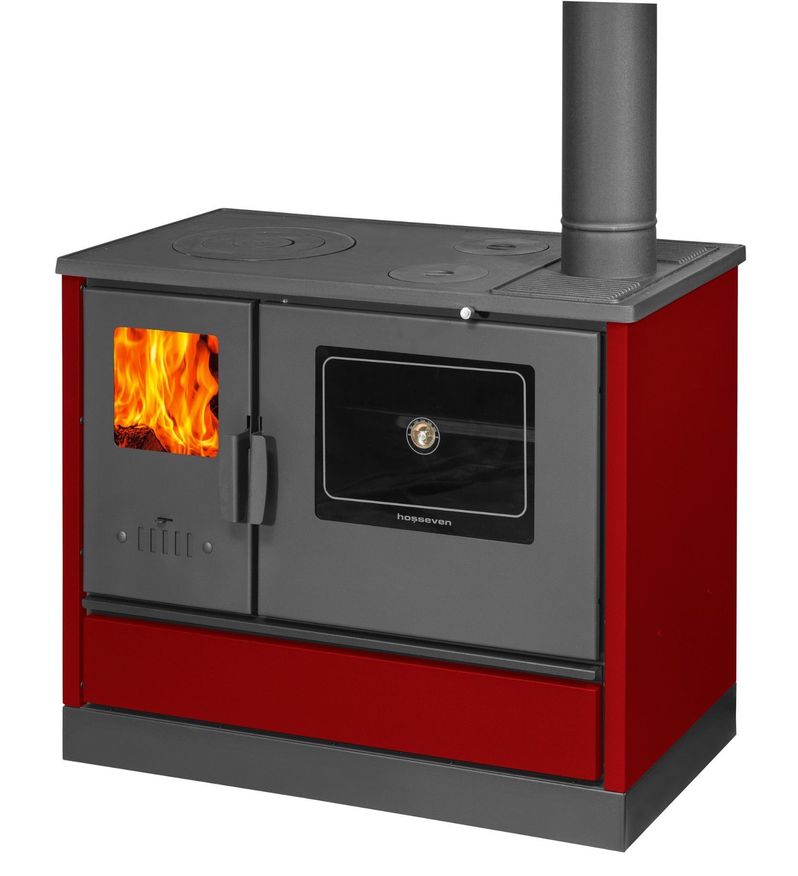 Облицовка камина из шамоттештейна гарантирует оптимальное распределение тепла и долговечность. Доступная в таких цветах, как антрацит, белый и бордовый, духовка с эмалированным термостойким покрытием легко впишется в любую кухонную обстановку, выдерживая температуру до 600°C.