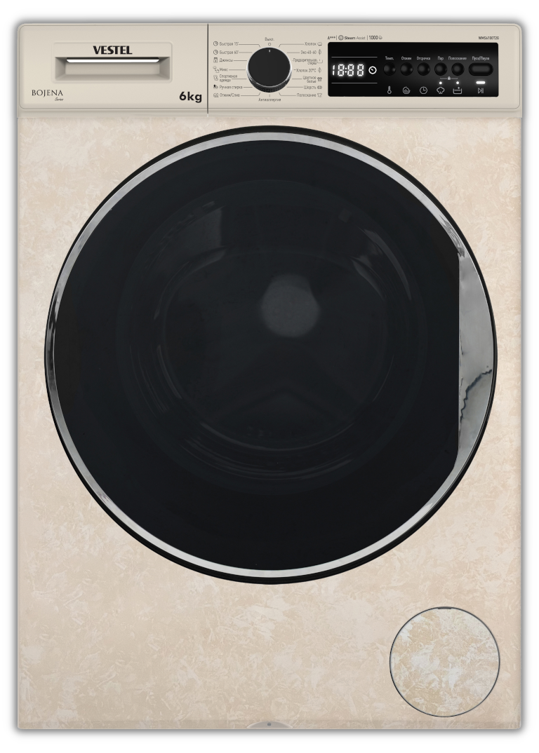 VESTEL Bojena WMS 6100 T2G Премиум! мраморно-бежевая, 6кг, 1000об, черный люк (большой (33-47)), с дисплеем, стиральная машина с паром