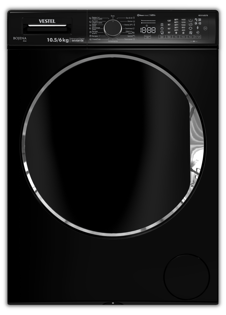 VESTEL Bojena WD 10140 D2TW Премиум!белая,10.5\6кг,1400об,черный люк(ультра-большой(51см)),Touchпанель,TwinJet,инверторная,стирально-сушильная машина с паром